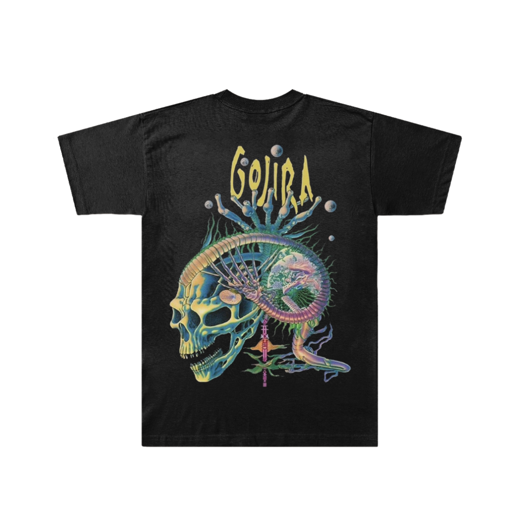 This black tee features graphics on the front and back. Printed on a black 65/35 recycled polyester/recycled airlume combed and ring-spun cotton t-shirt.